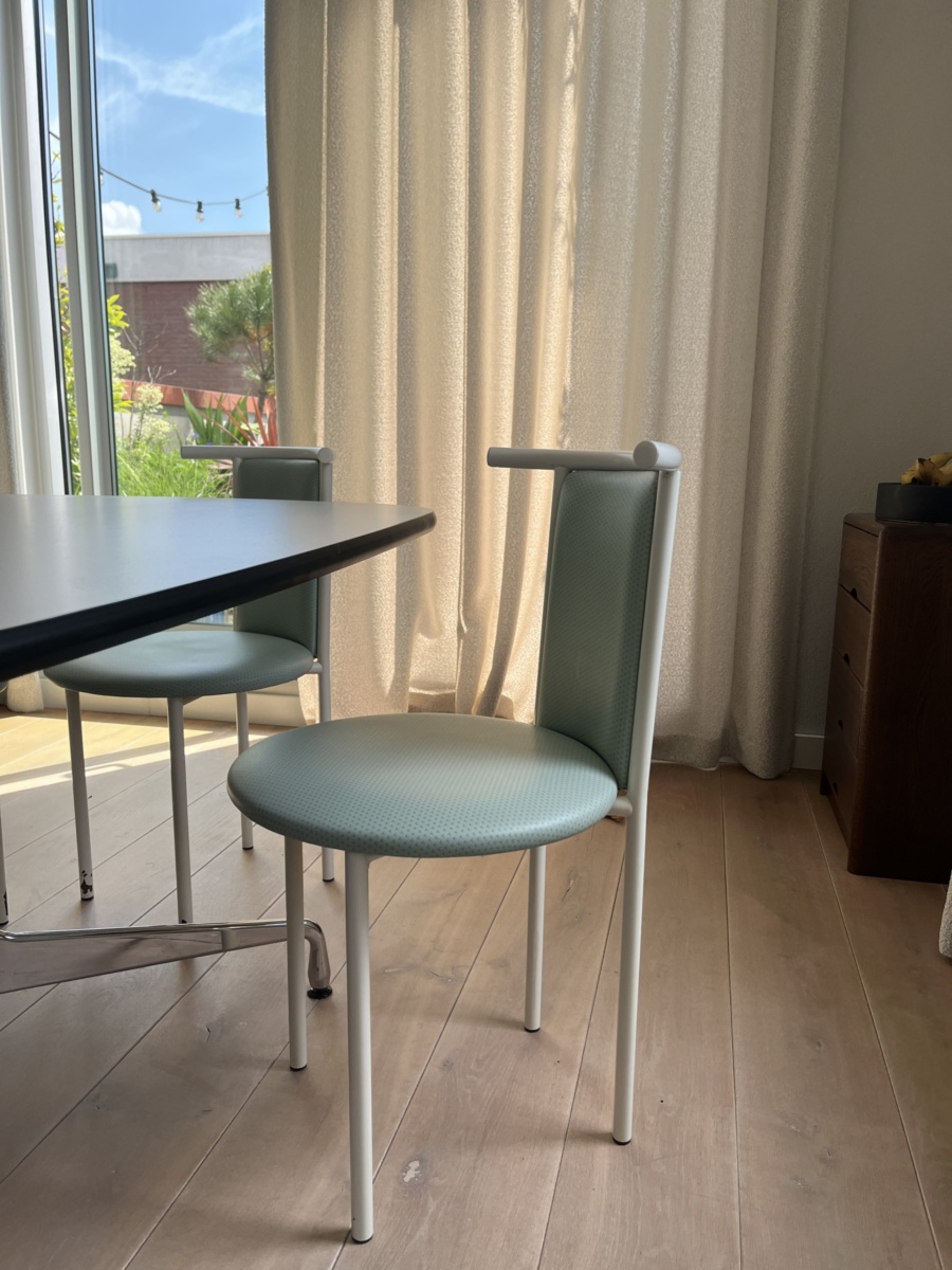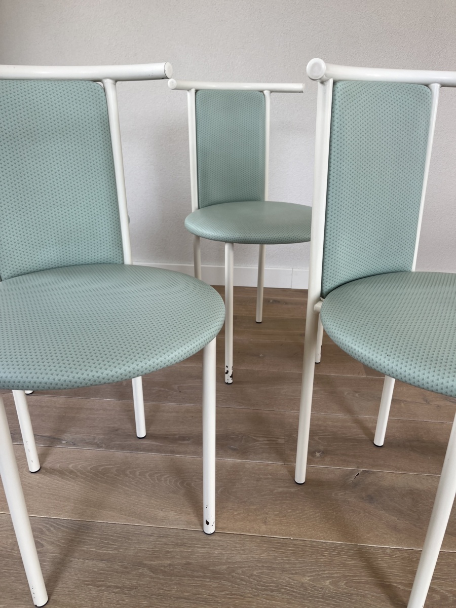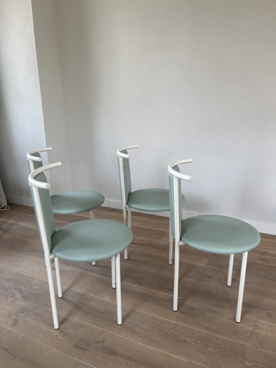 Set van vier postmoderne stoelen in de stijl van Memphis Milano. Deze unieke set van vier postmoderne eetkamerstoelen met een wit stalen frame, geïnspireerd op de iconische stijl van Memphis Milano. Deze stoelen zijn niet alleen een pronkstuk voor je interieur, maar ook een garantie voor originaliteit. De bekleding in een frisse mintkleur met een speels patroon voegt een extra vleugje karakter toe aan deze al prachtige stoelen. Met hun opvallende design brengen ze een vleugje retro chic in elke eetruimte. Verrijk je huis met deze tijdloze klassiekers en geniet van een unieke flair die alleen vintage meubels kunnen bieden.