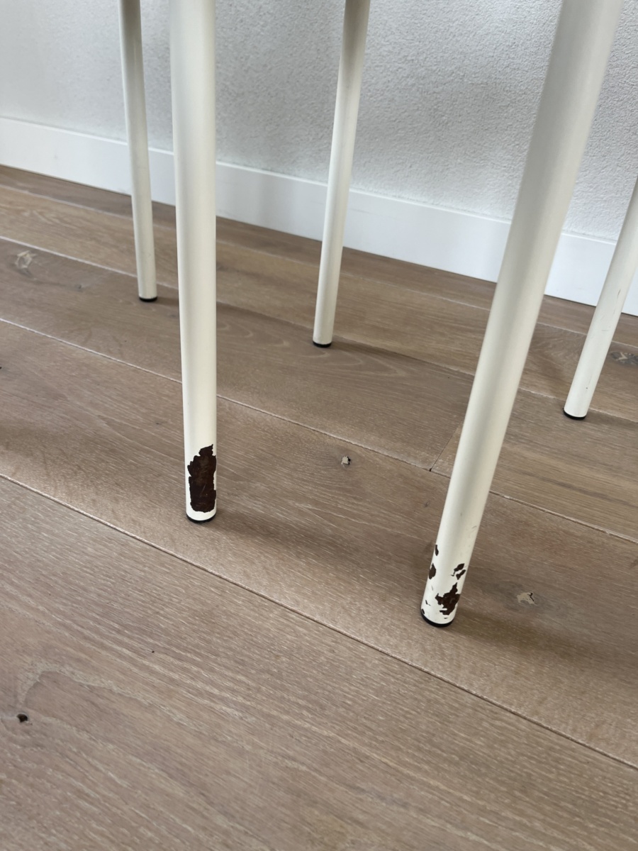 Conditie: Stoffering van 1 zitting heeft een klein (5mm gaatje), witte verf is van enkele stoelpoten beschadigd (zie foto’s).