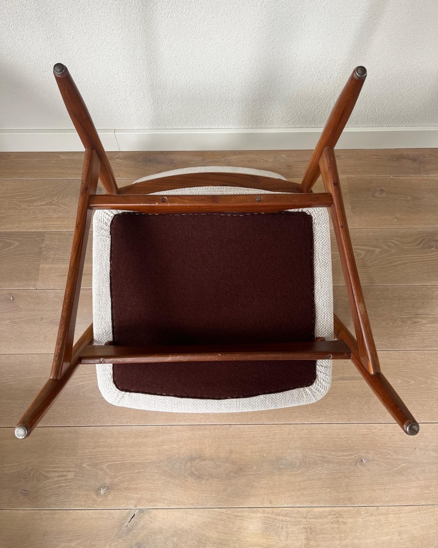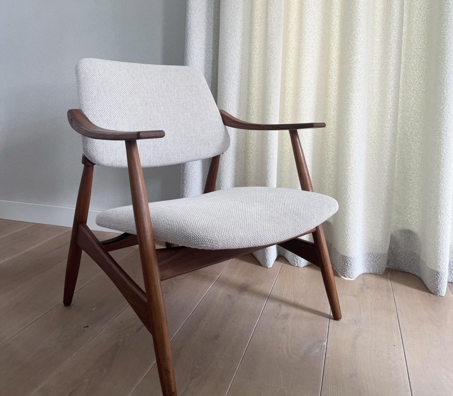 Een zeldzaam model van Louis van Teeffelen, met een tijdloos minimalistisch design. Deze prachtige stoel is vakkundig vervaardigd met een teakhouten frame en is voorzien van een luxe Bouclé stoffering.