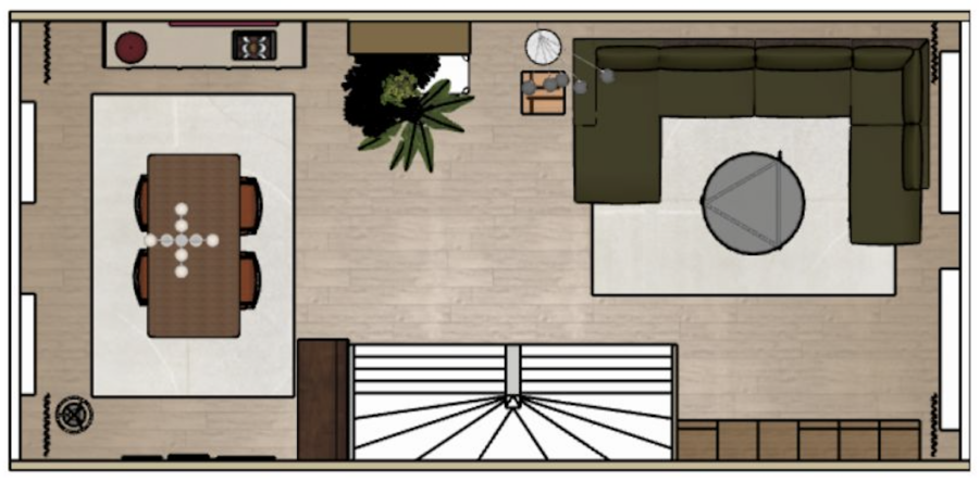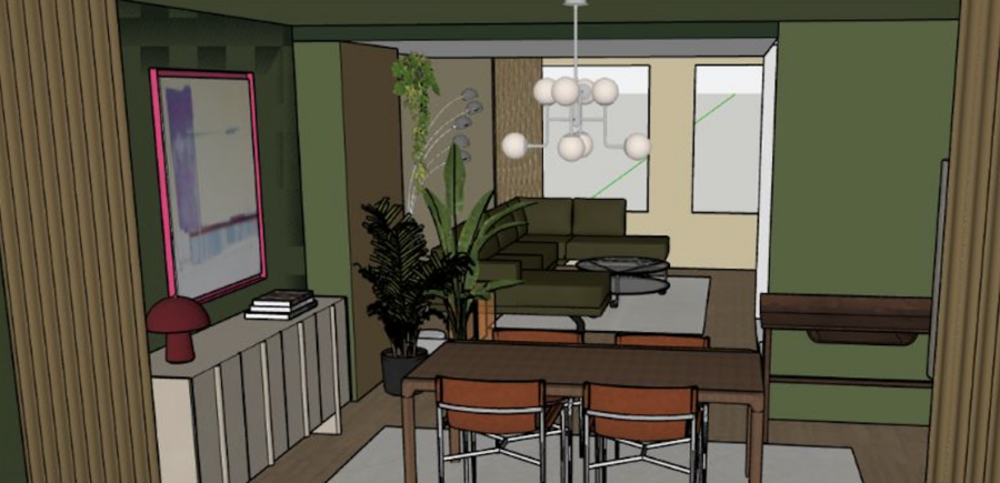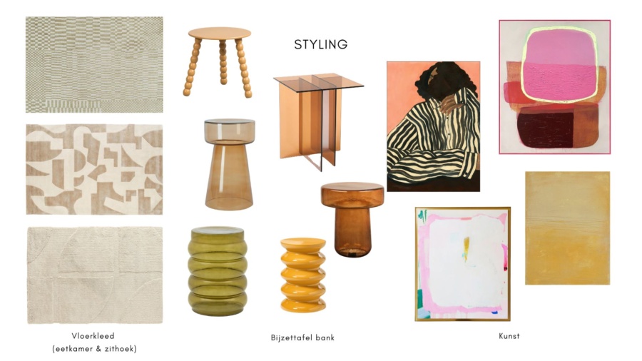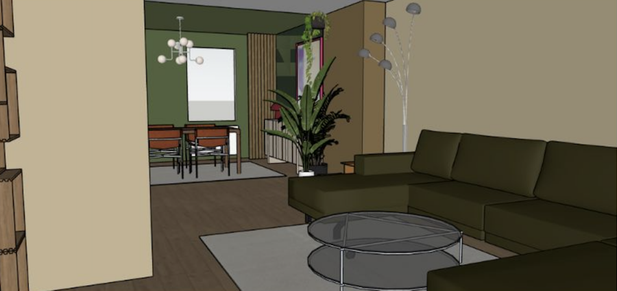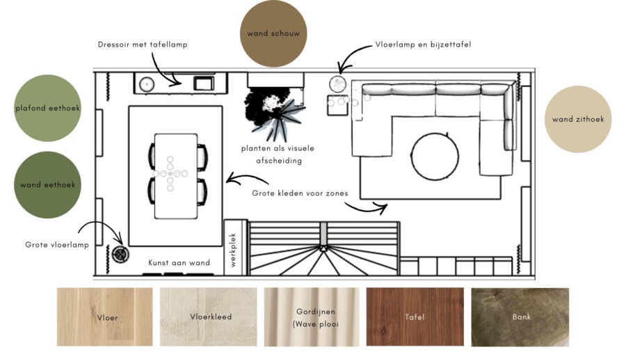 60m2 moderne woning sfeer toevoegen, warmte, bruikbare zithoek en tafel voor spelletjes en samenkomen, werkplek
