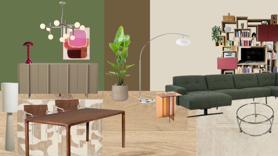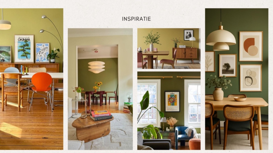 Vervanging vloer voor warm hout, warme tinten, olijfgroen, vintage en moderne meubels combinatie, hergebruik emotioneel waardevolle elementen. Uitgesproken accesoires stijling en lichtplan