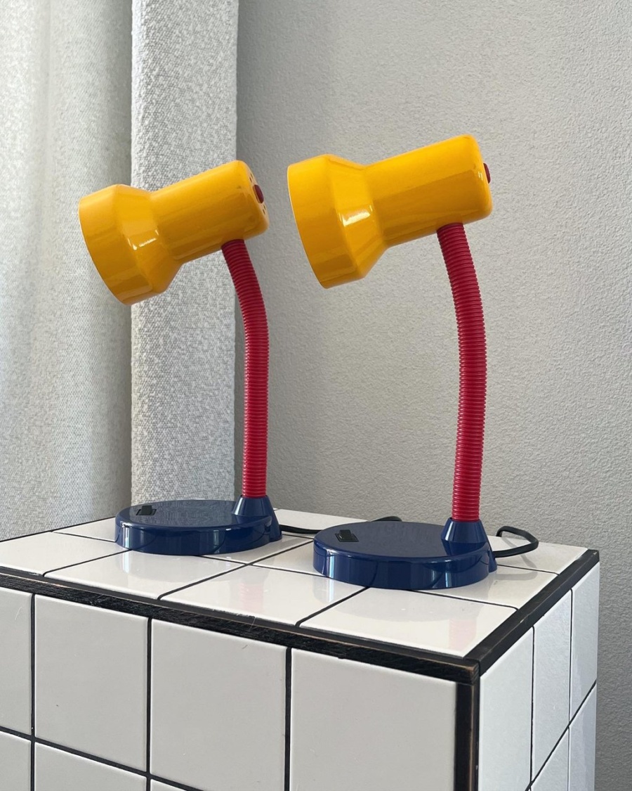 Vintage 80’s Memphis stijl lampen. De lampen hebben een flexibele rode buis waardoor de kap in diverse posities geplaatst kan worden.