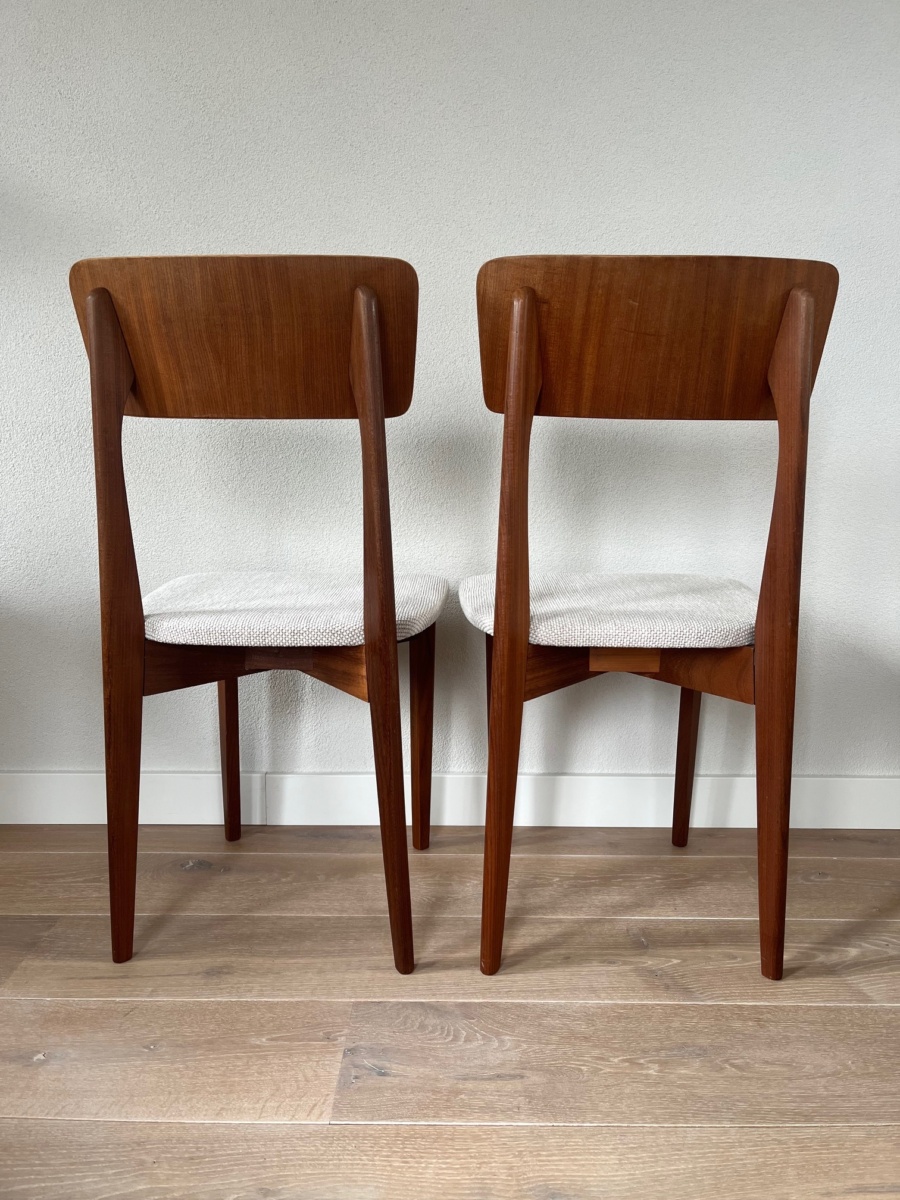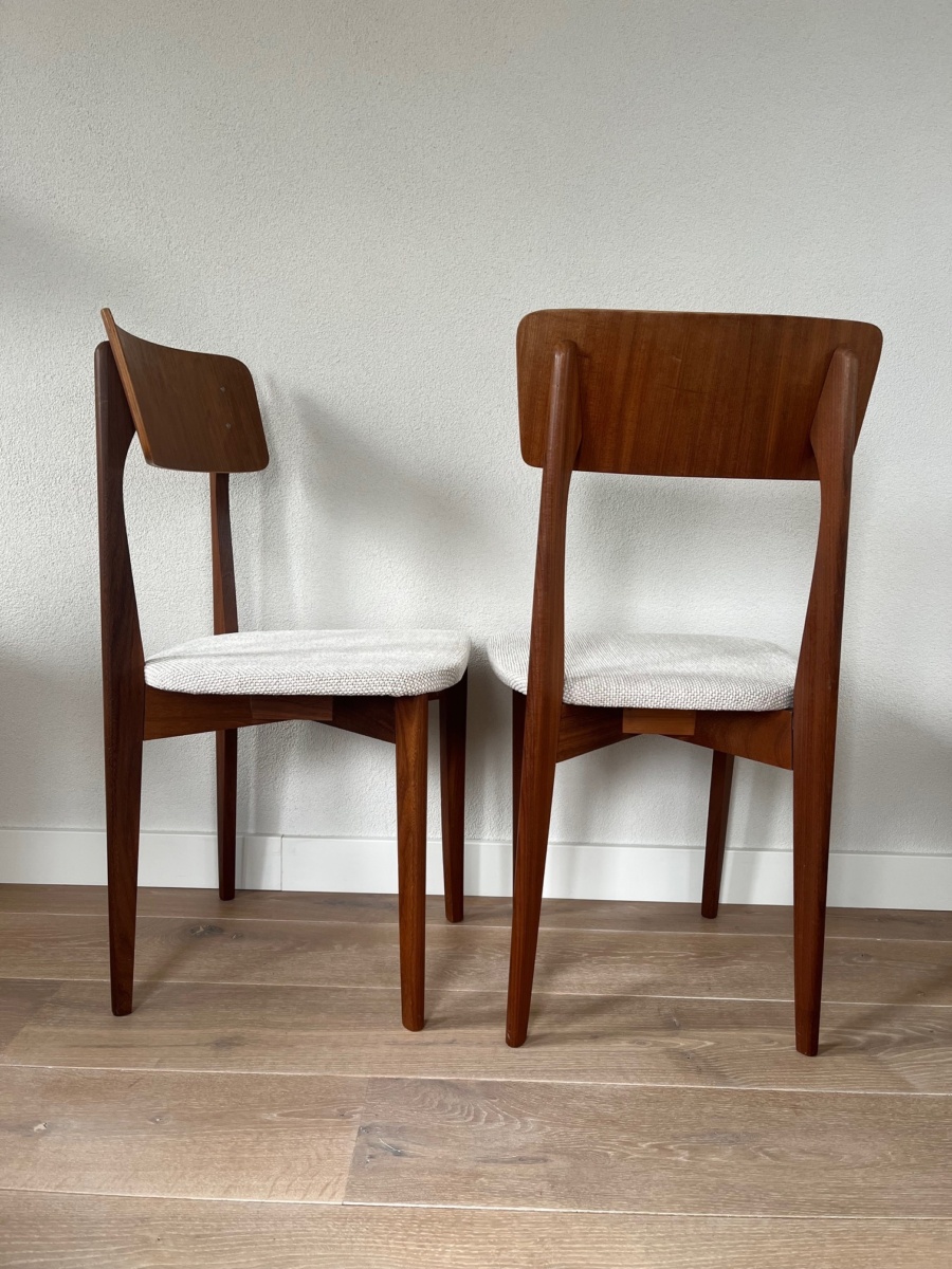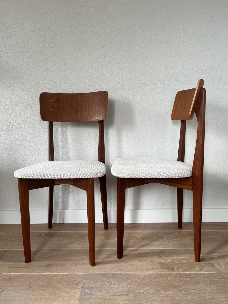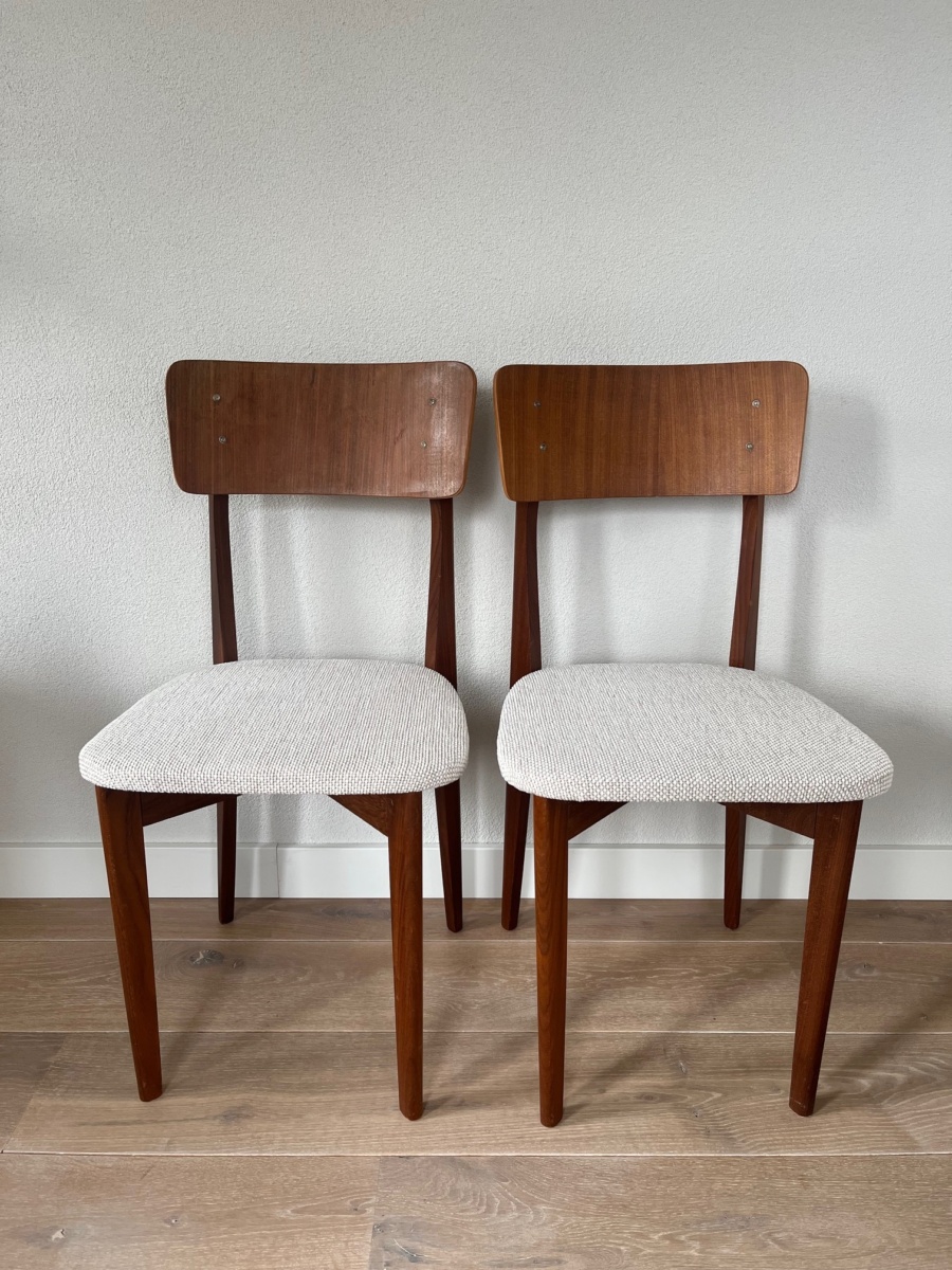 Set van twee Louis van Teeffelen Wébé eetkamerstoelen. Midcentury stoelen houten frame met nieuwe schuim en stoffering.