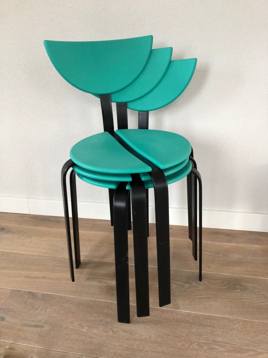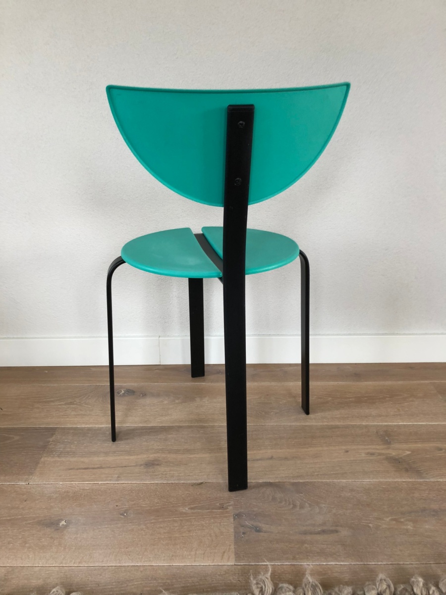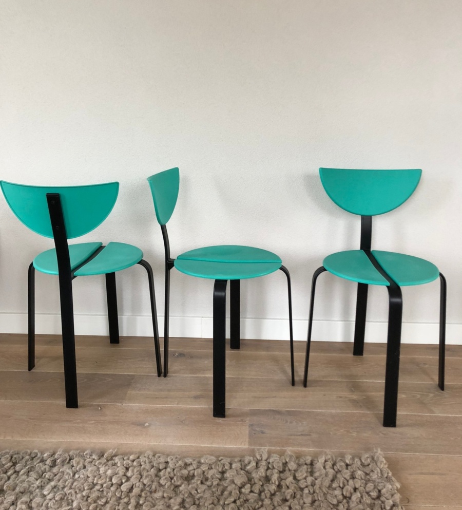 Set van 3 post moderne stoelen van Niels Gammelgaard en Lars Mathiasen voor Bent Krogh, 1980 In goede vintage staat. Kunststof turquoise zitting en zwart stalen frame. Stapelbaar in post modern / Memphis Milano stijl