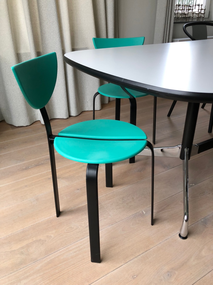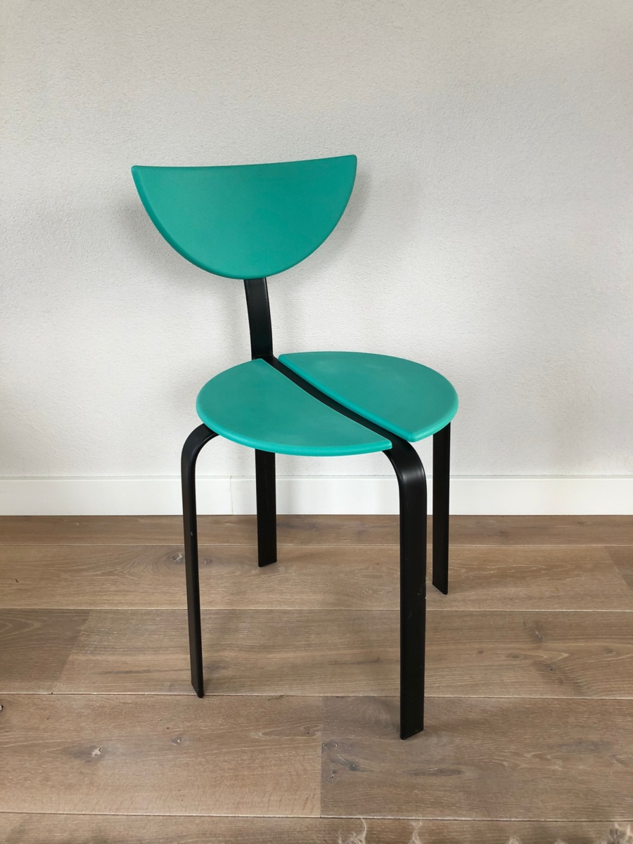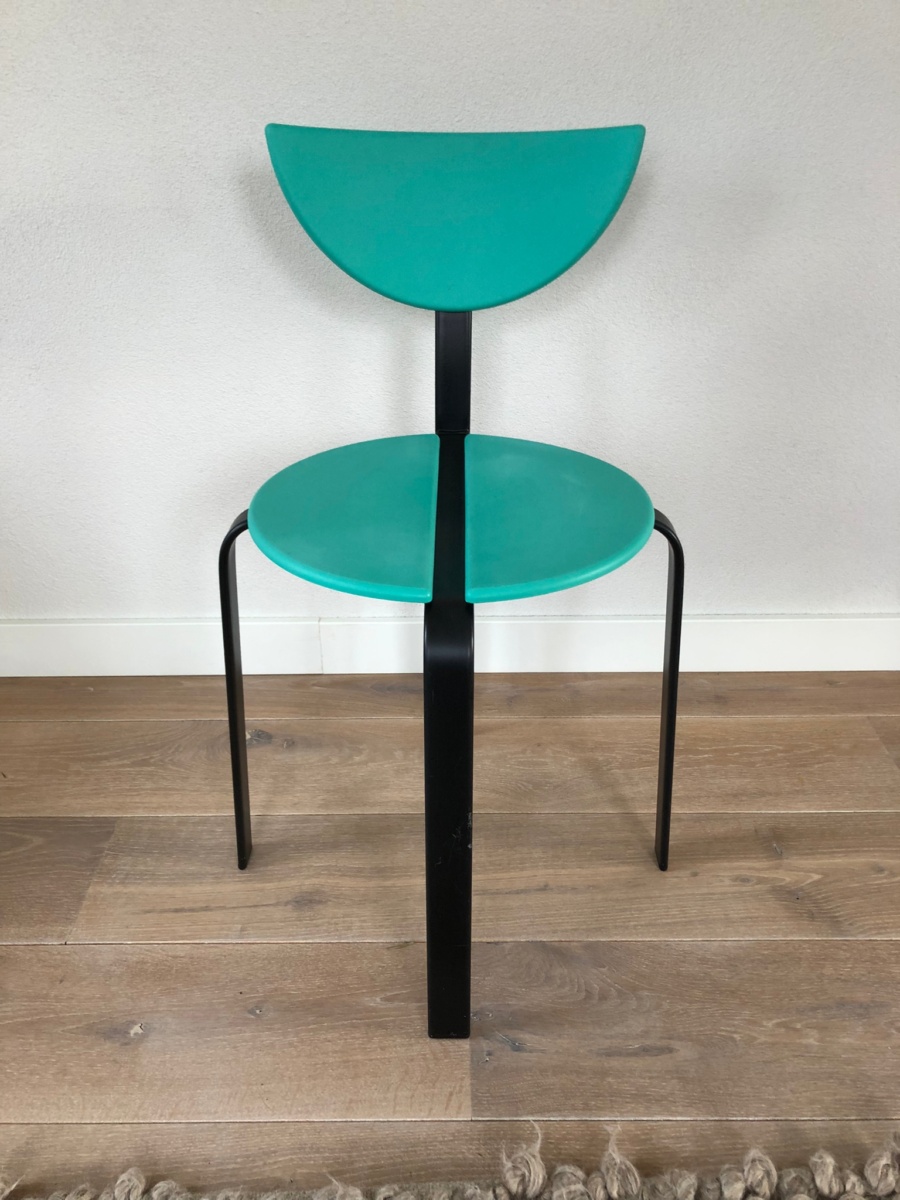 Set van 3 post moderne stoelen van Niels Gammelgaard en Lars Mathiasen voor Bent Krogh, 1980 In goede vintage staat. Kunststof turquoise zitting en zwart stalen frame. Stapelbaar in post modern / Memphis Milano stijl