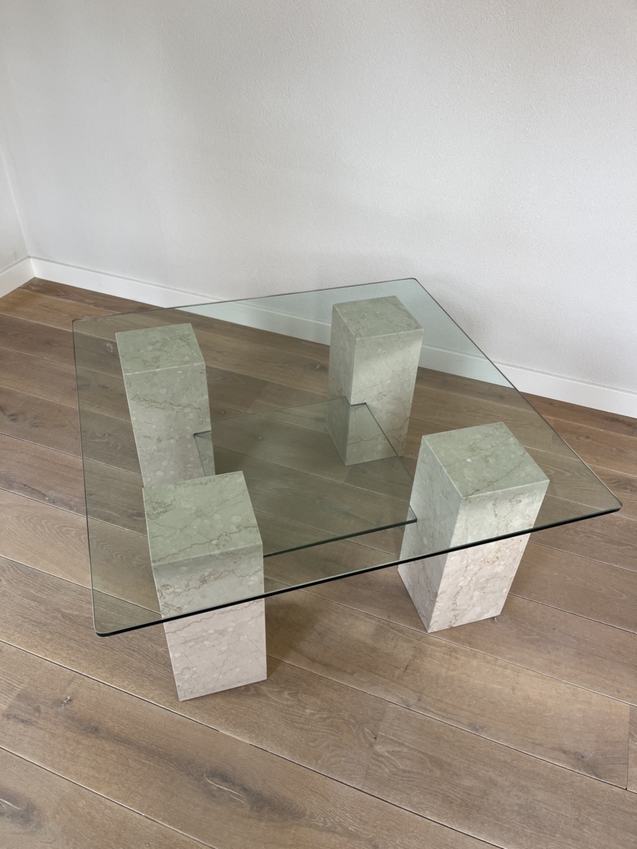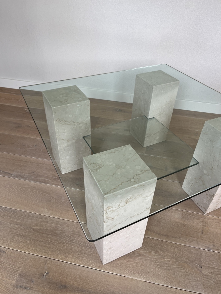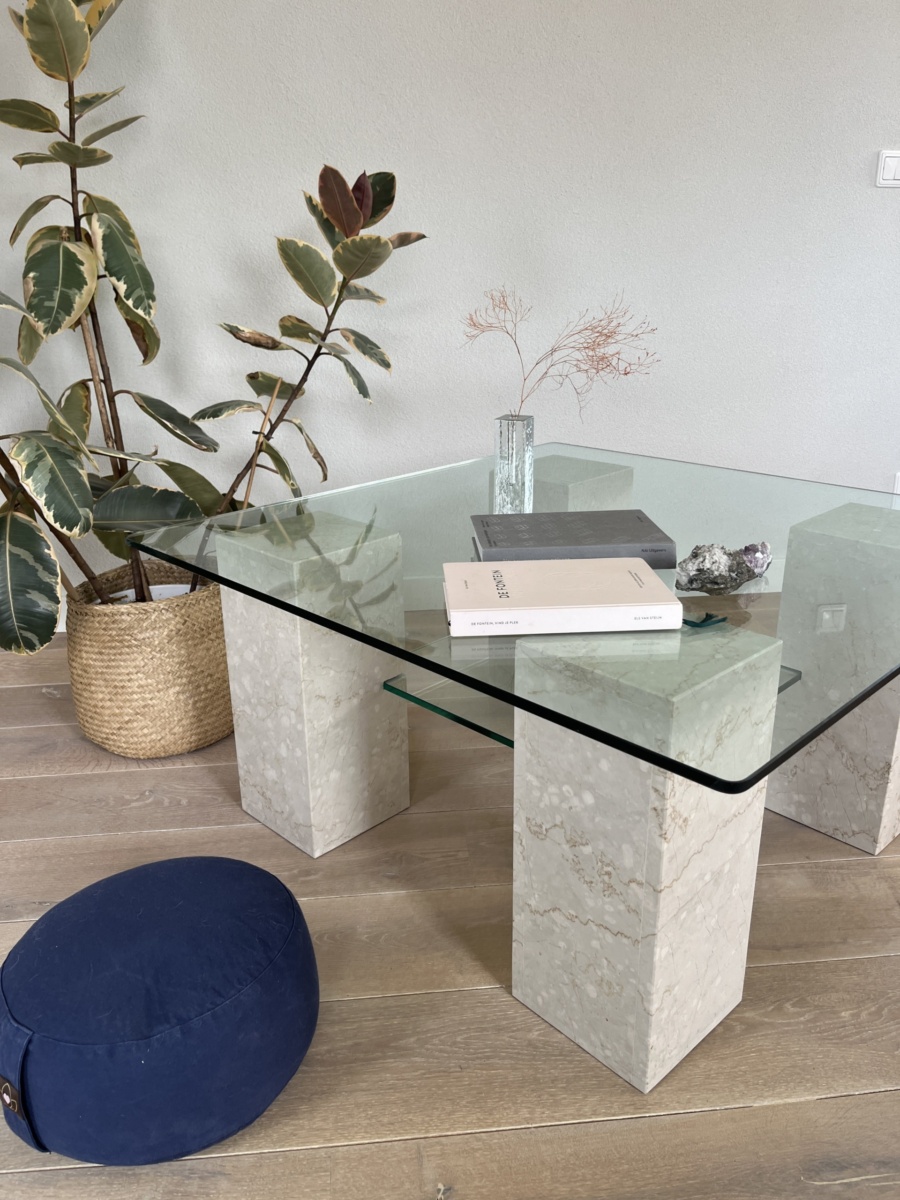 Unieke travertin natuursteen salontafel, bestaande uit 4 travertin kolommen en 2 glasplaten. Deze prachtige salontafel is geproduceerd in Italië rond 1970, waar vakmanschap en kwaliteit samenkomen. Hoewel ze lichte natuurlijke gebruikssporen vertoont door haar leeftijd, behoudt ze haar unieke charme en karakter.