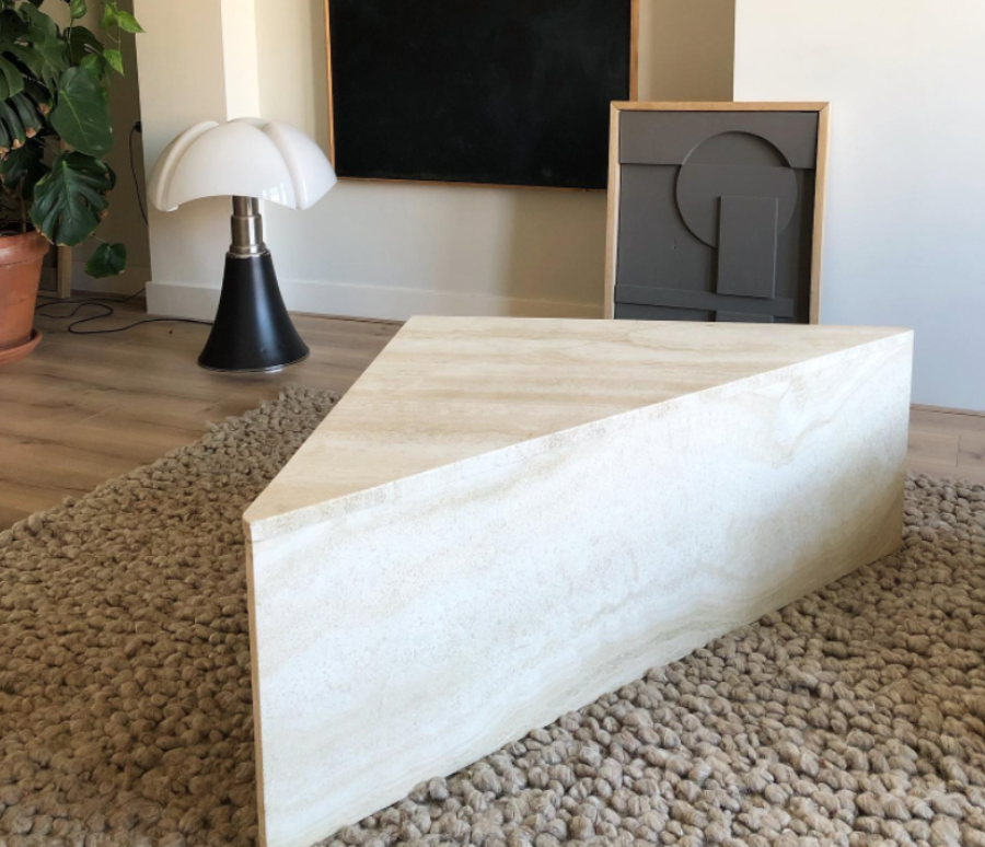 Prachtige vintage natuurstenen travertin salontafel driehoekig