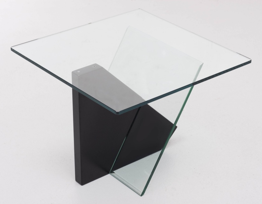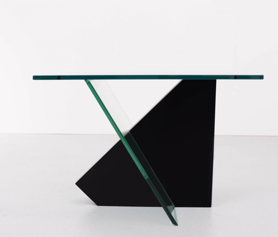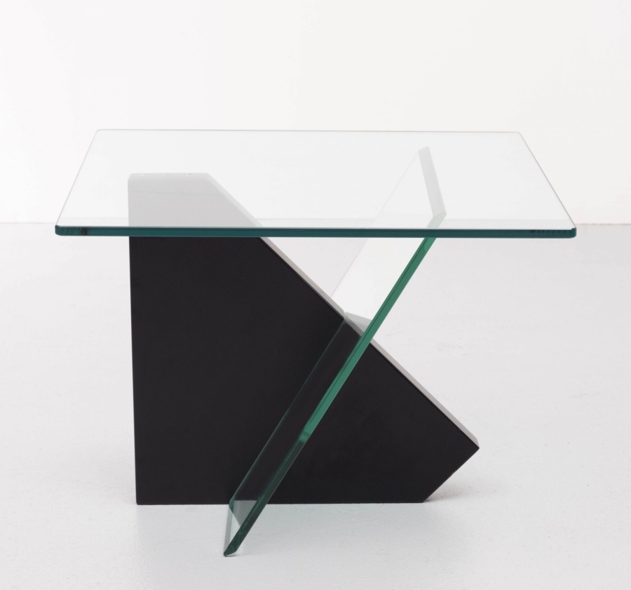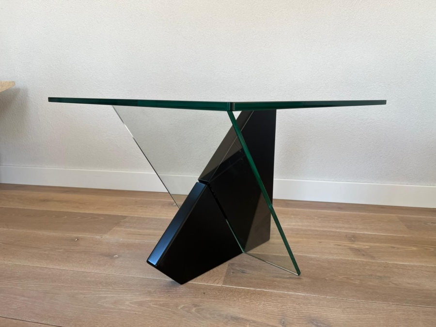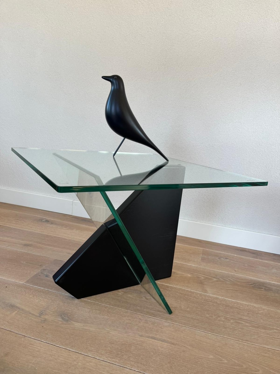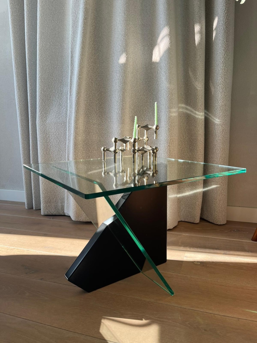 Vintage Post modern Italiaans design salontafel/bijzettafel. Jaren 80 design glazen salontafel met houten zwart gelakte schuine voeten verbonden met een glazen plaat. In zeer goede staat.